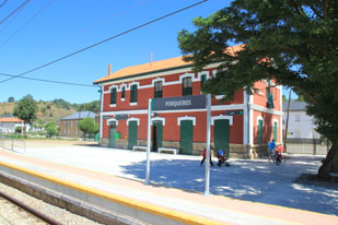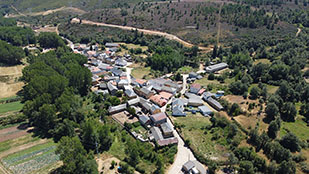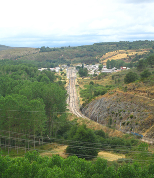 Fotos aéreas tomadas en verano del pueblo y la estación. Desde las distintas colinas como la corona. Aparece el rio Porcos atravesando el pueblo, así como el trazado de las vías del tren que dividen el pueblo.  |